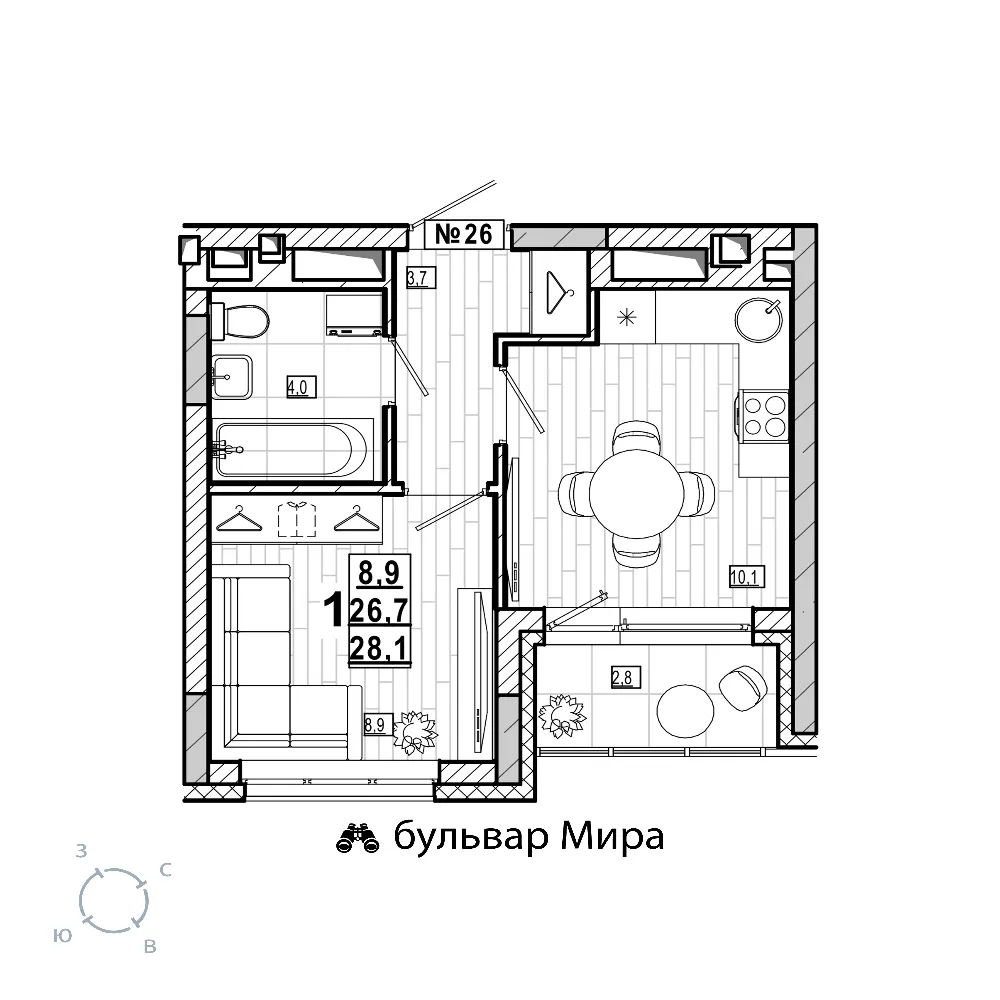 Площадь лоджии2.8 м2