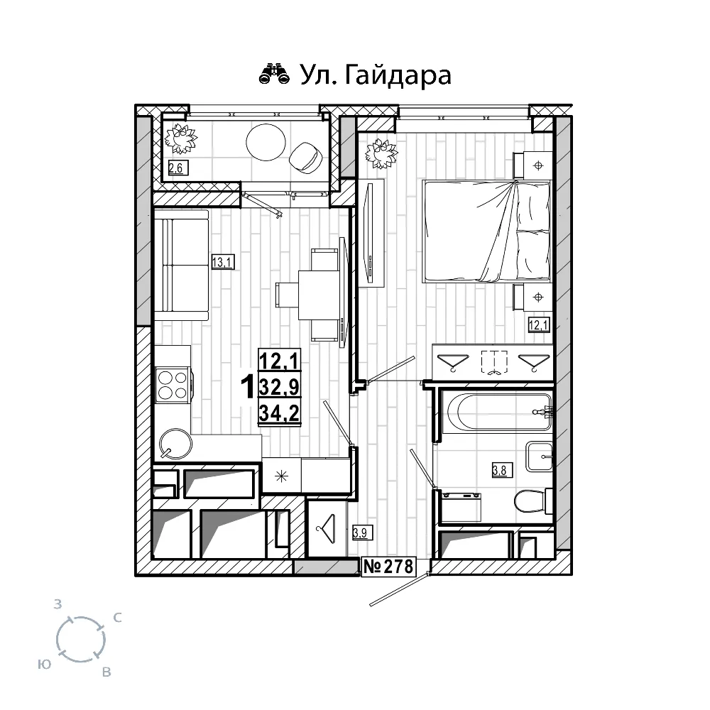 Площадь лоджии2.6 м2